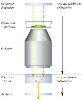 聚光鏡內的狹縫光闌足以使光線轉變l/4波長,結果就形成清晰的干涉圖像。另外,對比度也可方便調節以適應不同的觀測目標物。塑料DIC是第一種讓人們能夠使用塑料容器觀察的偏振光學DIC方法。